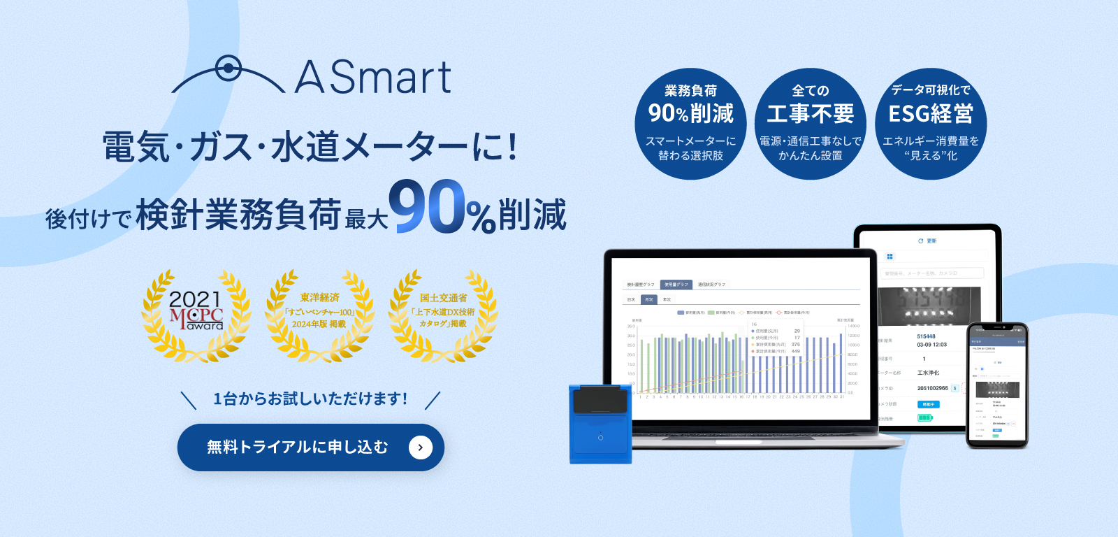 A Smartを設置するだけで、既設メーターを活かしたまま検針業務をワンストップで無人化。コストと手間は最小限に抑えながら、業務効率化と人手不足解消を叶える、まったく新しい選択肢です。